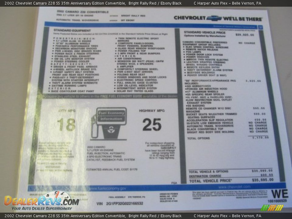 2002 Chevrolet Camaro Z28 1 Owner Leather Auto Window Sticker www.platinummoto.com
