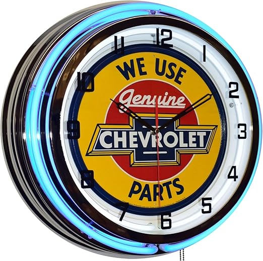 Dressed to impress the engine bay is a beautiful combination of chrome and neon green paint including chevrolet chrome valve covers and a matching air cleaner set against the neon green firewall and black inner fenders. Prior to the introduction of neon in the 1930s dealer signs often used an array of flashing colored light bulbs to highlight the graphics. 350000 chevrolet art deco clock dealer neon sign.